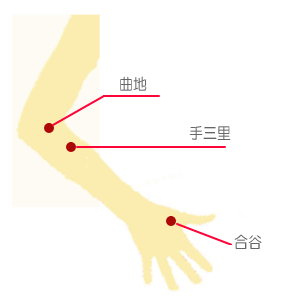 肌荒れには手にある「合谷」(ごうこく)や、腕の「手三里」(てさんり)「曲地」(きょくち)がよいそうです。